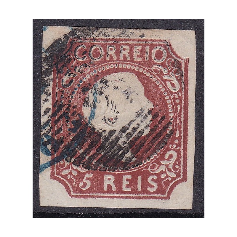 Nº 5 selo de 5 reis castanho com 2 margens normais e 2 curtas. Exemplar em boas condições.