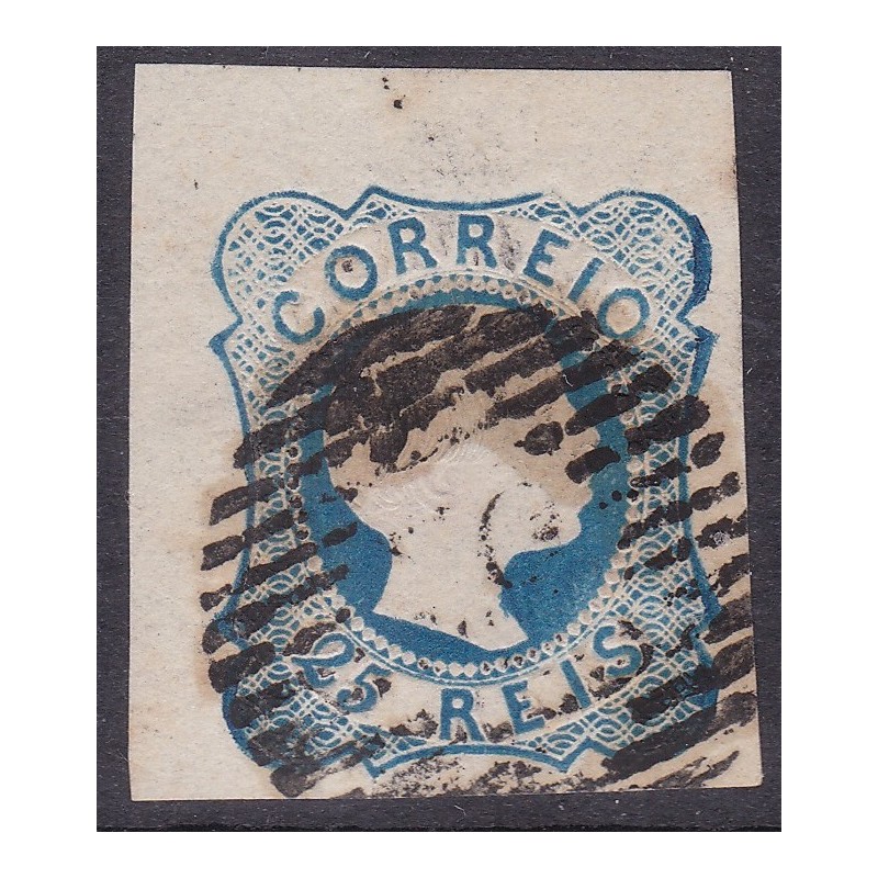 Nº 6 selo de 25 reis azul com pérolas afastadas e margens simétricas. Exemplar em boas condições.