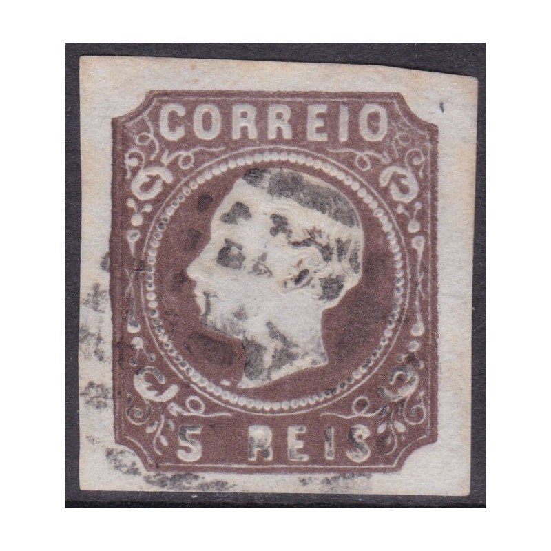 Nº 14 selo de 5 réis castanho. TIPO I com margens normais e carimbo Porto. Exemplar em boas condições.