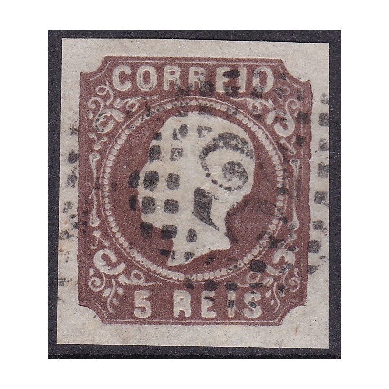 Nº 14 selo de 5 réis castanho. TIPO I com margens normais e carimbo Porto. Exemplar em boas condições.