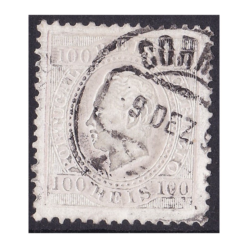 Nº 43 selo de 100 réis lilás papel porcelana, denteado 12½. Carimbo muito forte.