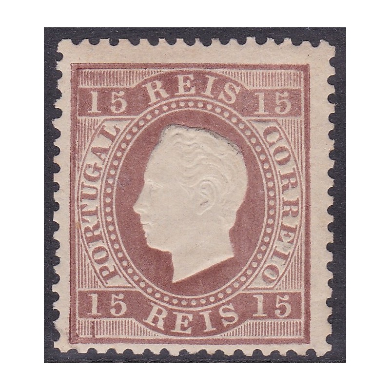 Nº 38 selo de 15 réis castanho, com goma original e com charneira, denteado 12½. Exemplar reparado no canto direito.