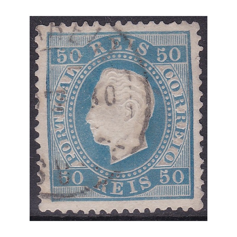 Nº 50 selo de 50 réis azul papel liso denteado 13½. Exemplar com carimbo bastante carregado.