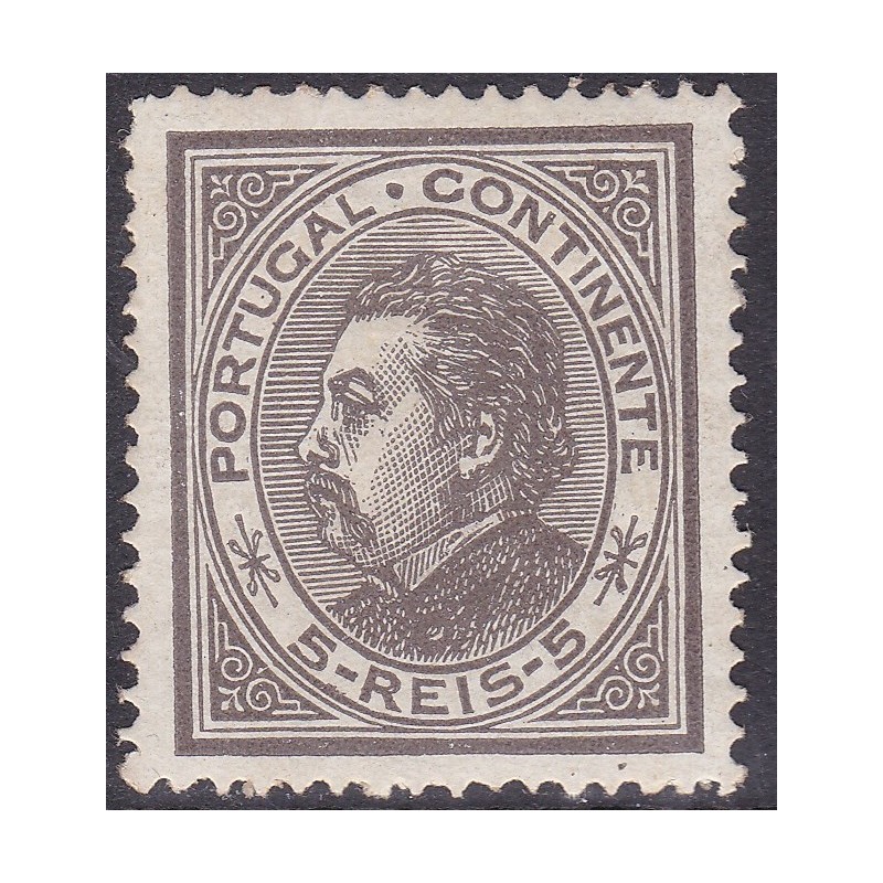Nº 52 selo de 5 réis preto papel porcelana denteado 13½ com charneira e goma original - Exemplar com denteado um pouco irregular.