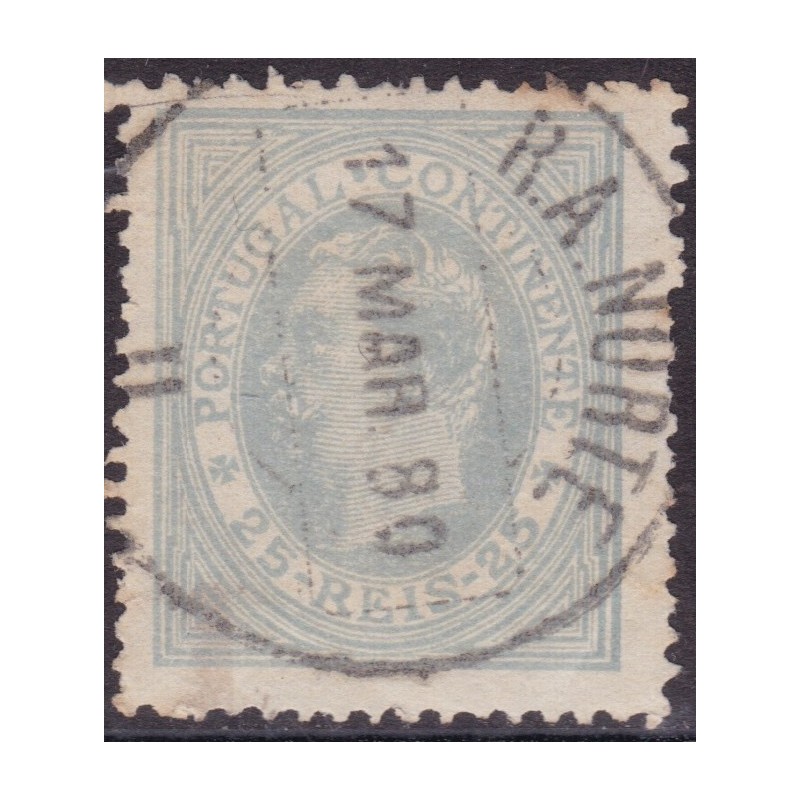 Nº 53 selo de 25 réis azul cinzento papel liso denteado 12½, com charneira e goma original - Exemplar descentrado mas em boas condições.