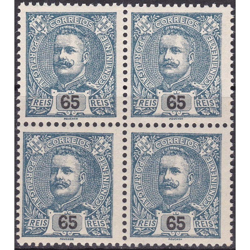 Bloco de 6 selos nº 143 selo de 65 réis azul cinzento, sem charneira e goma original. Exemplar com pontos de oxido.