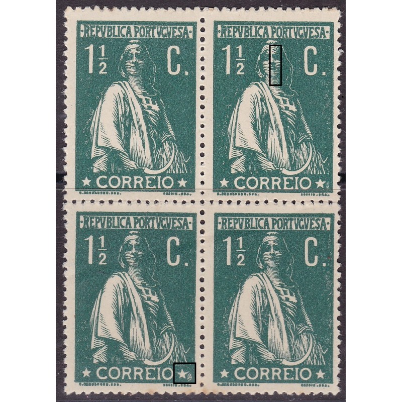 Quadra nº 222 sem charneira e goma original, papel pontinhado e denteado 15x14 variedade de cliché XXV e outro. Exemplar com vinco no verso.