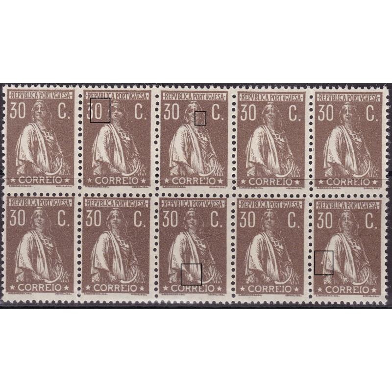 Bloco nº 242 castanho amarelo sem charneira e goma original, papel pontinhado vertical. Variedades de cliché XXIII / XXIX e XXXVI. Exemplar em boas condições.