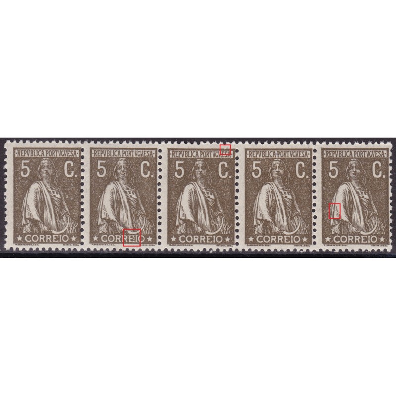 Tira nº 254 sem charneira, papel liso e denteado 12x11½, variedades de cliché VI e VII. Exemplar em boas condições.