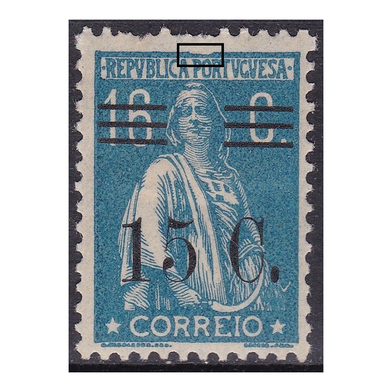 Selo nº 459 novo com charneira, papel liso. Variedade de cliché IV. Exemplar com denteado defeituoso.