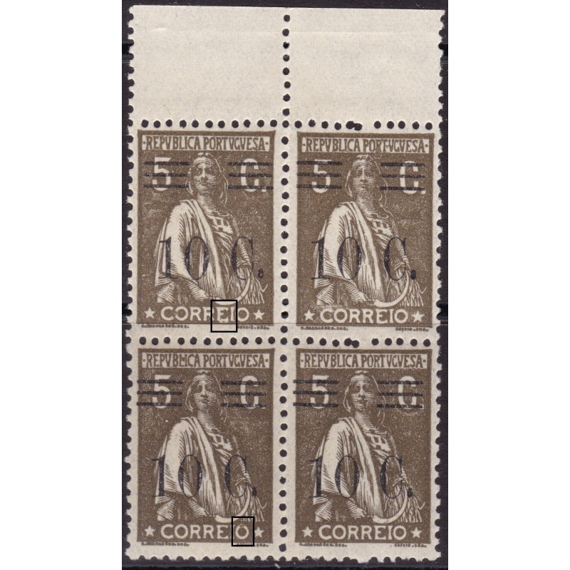 Quadra nº 458 sem charneira em papel liso com variedades de cliché XVII e outra não catalogada. Exemplar em boas condições.
