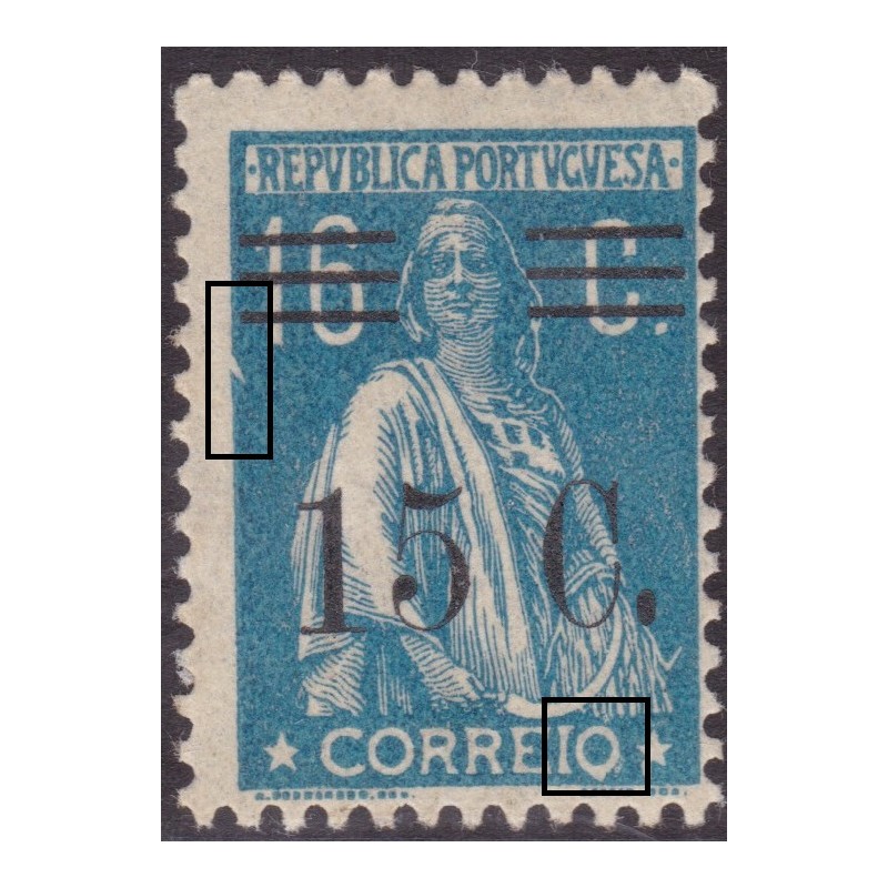 Selo nº 459 novo com charneira, papel liso. Variedade de cliché IV. Exemplar com denteado defeituoso.