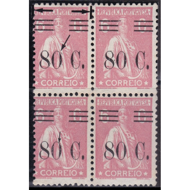 Quadra nº 456 usado em papel liso com variedade de cliche não catalogada e sobrecarga defeituosa. Exemplar em boas condições.