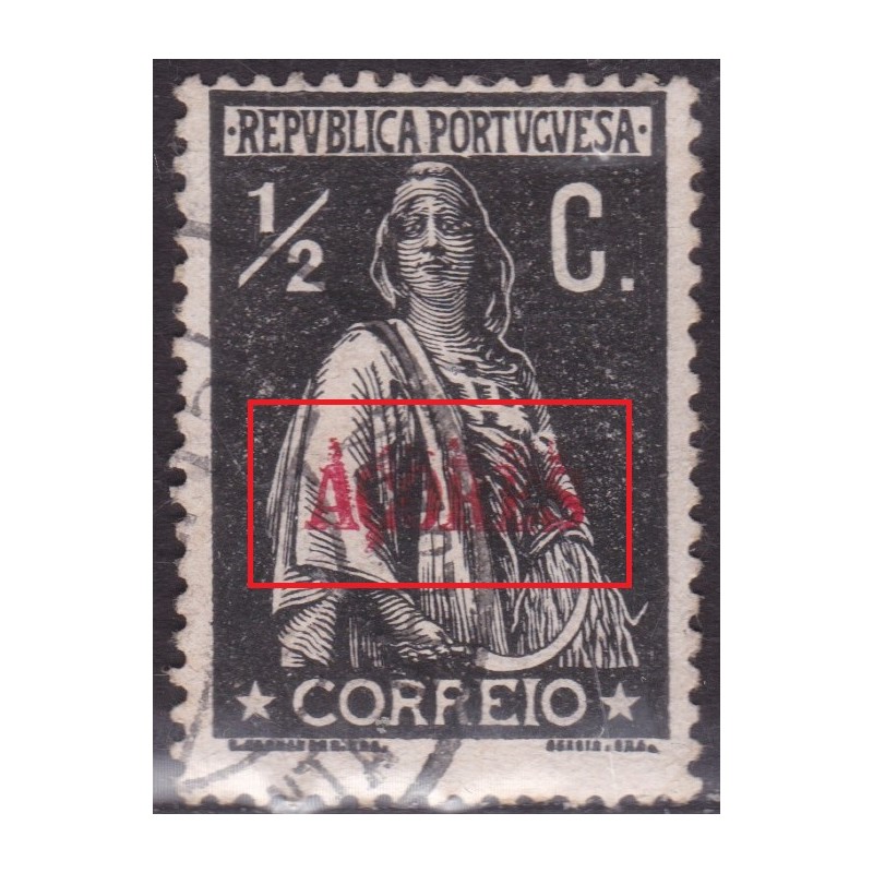 DUPLA Sobrecarga Açores - Selo Nº 150 usado, papel porcelana em denteado 15x14. Exemplar em boas condições.