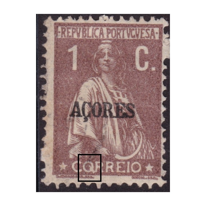 Sobrecarga Açores Dupla - Selo nº 150, variedade de cliche XXI em papel pontinhado vertical e denteado 15X14. Exemplar em boas condições.