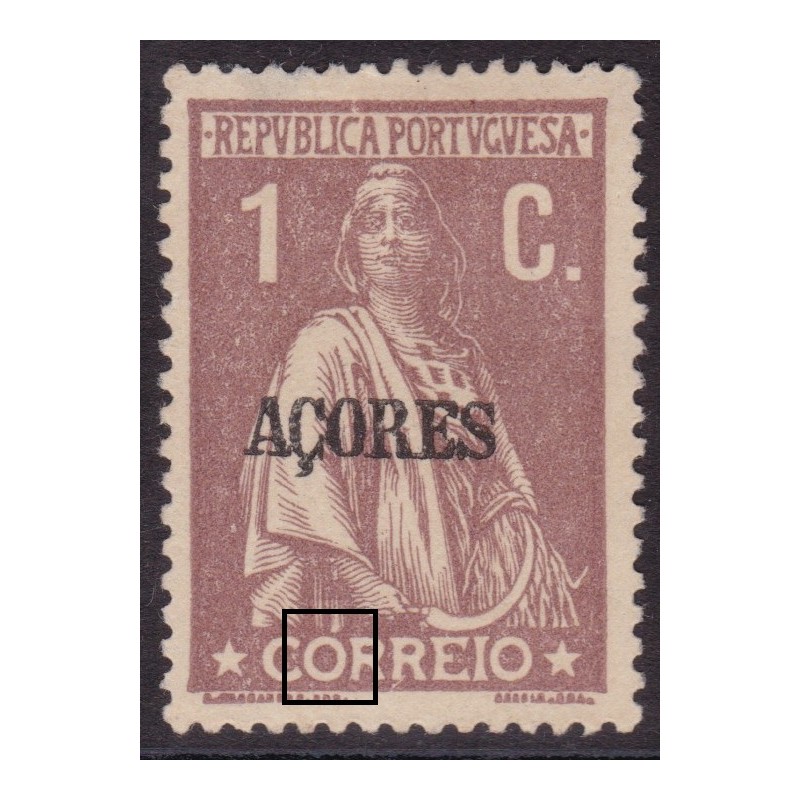 Sobrecarga Açores Dupla - Selo nº 150, variedade de cliche XXI em papel pontinhado vertical e denteado 15X14. Exemplar em boas condições.