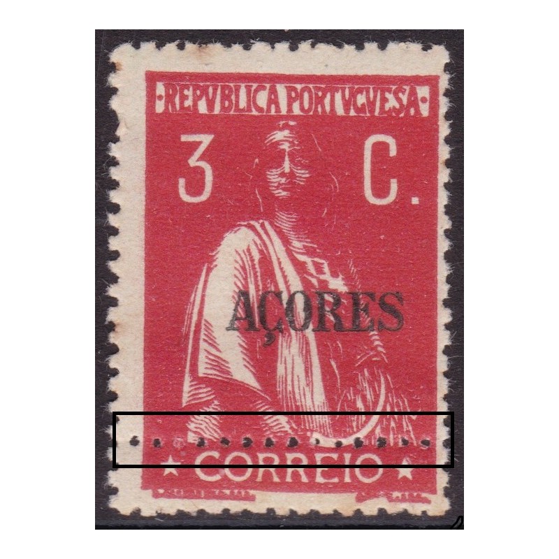 Sobrecarga Açores Deslocada - Selo nº 167 com papel acetinado fino e denteado 15X14. Exemplar com efeitos.