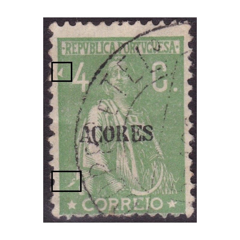 Sobrecarga Açores Deslocada - Selo nº 167 com papel acetinado fino e denteado 15X14. Exemplar com efeitos.