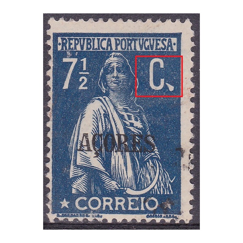 Sobrecarga Açores Dupla - Selo nº 150, variedade de cliche XXI em papel pontinhado vertical e denteado 15X14. Exemplar em boas condições.