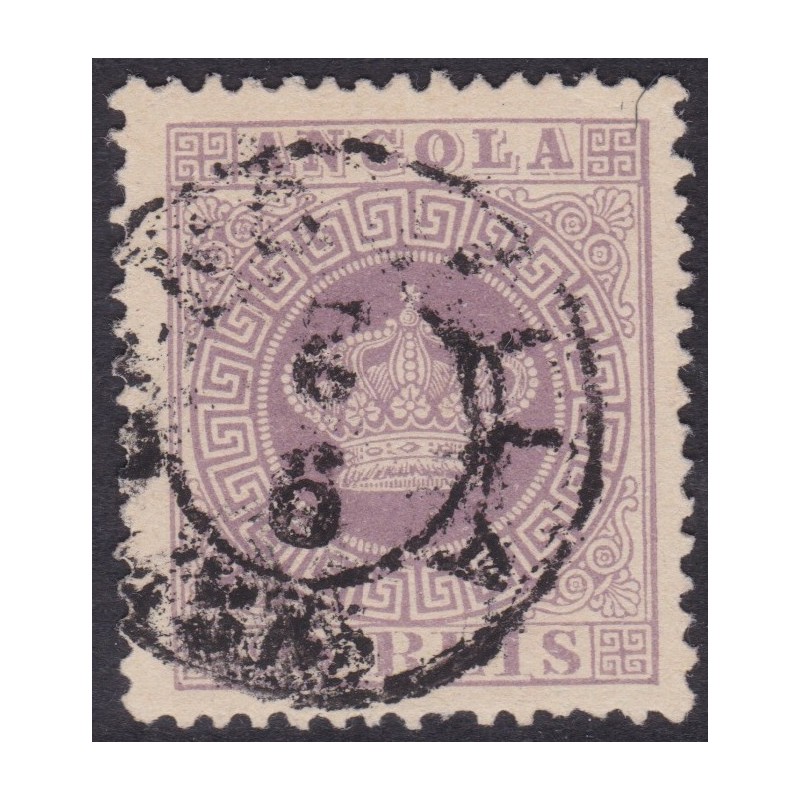 Selo com marca "Correio de Mossamedes" nº 14 usado em papel liso e denteado 12½. Exemplar com pequena transparência no verso e traço a vermelho.