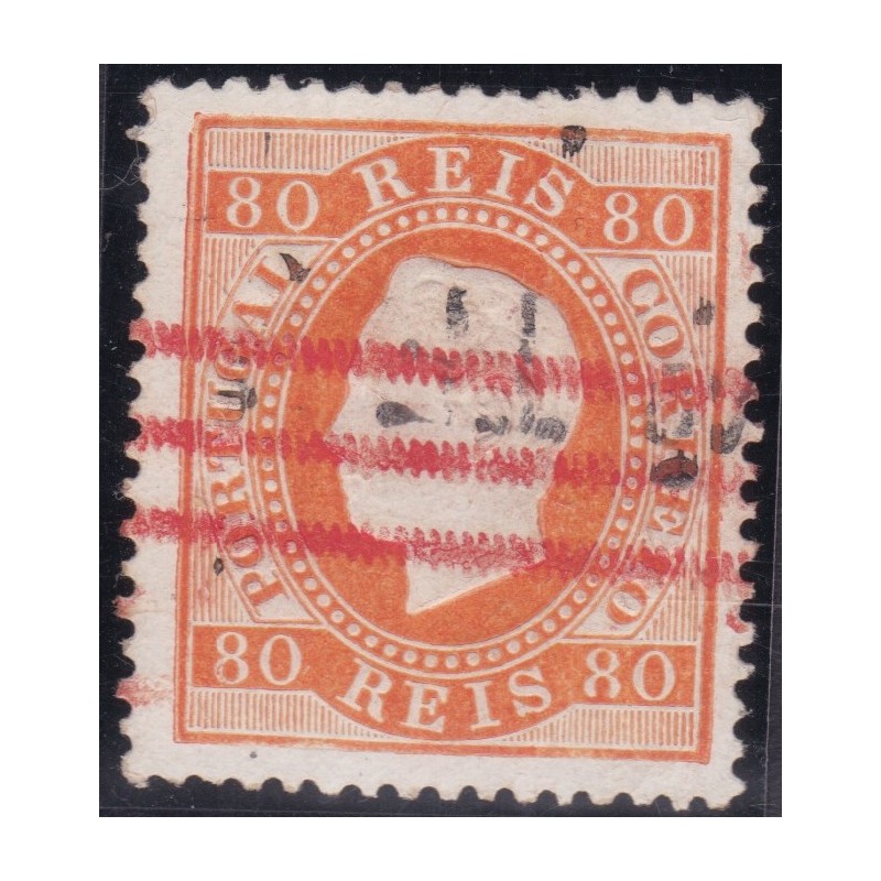 TELEGRAFO - Nº 43 selo de 80 réis laranja papel porcelana denteado 13½. Com traço de tinta com roletes utilizados em telegramas. Exemplar em boas condições.