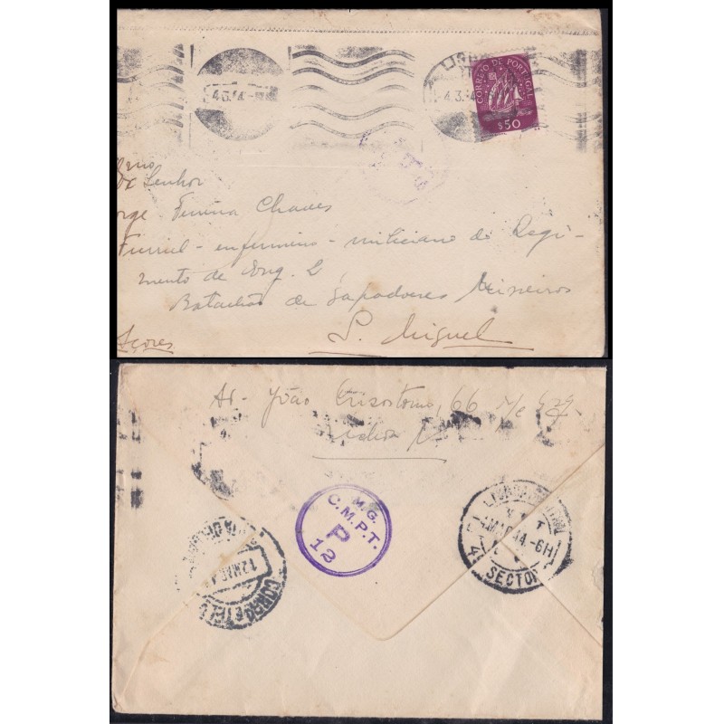 Sobrescrito circulado a 12 de Março de 1944. Com marca de Censura circular "M.G. C.M.P.T. P 12 no verso. Exemplar em boas condições.