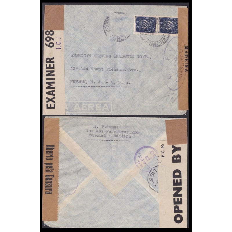 Sobrescrito circulado em 1943. Com Cinta de censura em papel com a legenda "Aberto pela Censura Madeira " e outra dos Estados Unidos, marca de Censura oval C.M.P.T. C4 a violeta. Exemplar em boas condições.