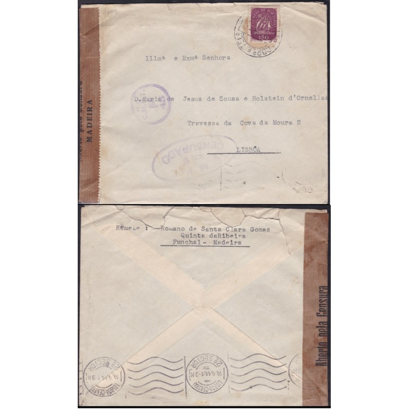 Sobrescrito circulado a 18 de Setembro de 1940. Com uma Cinta de censura em papel com a legenda " Aberto pela Censura Madeira" e outra "Opened By Examiner 1987" e carimbo Oval "C.M.P.T. C4 Censurado". Exemplar em boas condições.