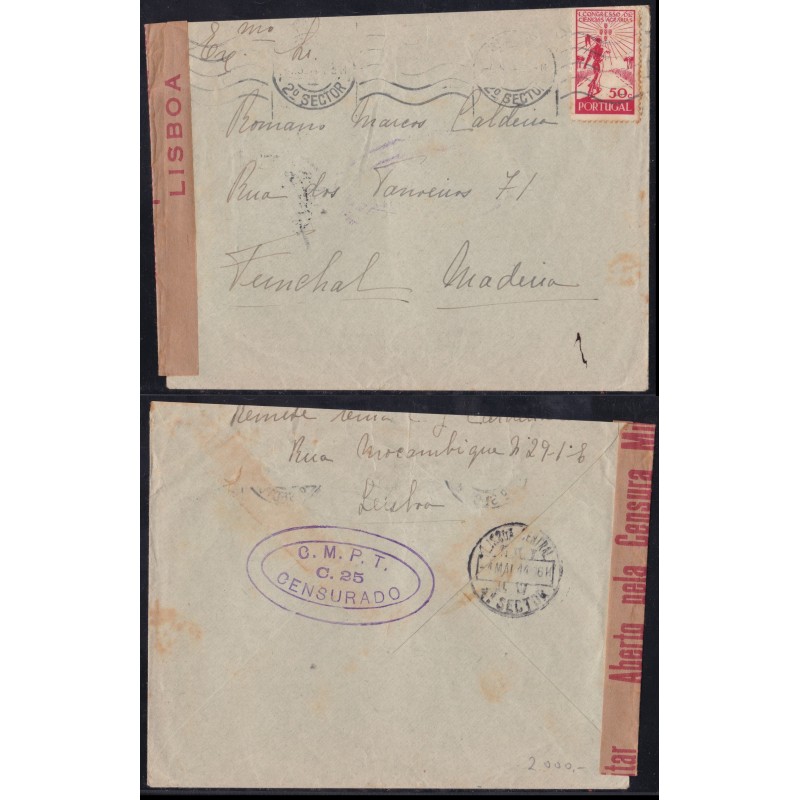 Sobrescrito circulado a 1 de Maio de 1944. Com Cinta de censura em papel com a legenda "Aberto pela Censura Militar Lisboa" e carimbo oval "C.M.P.T. C25 Censurado" a violeta. Exemplar em boas condições.