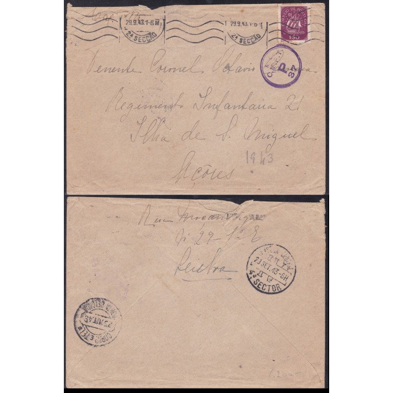 Sobrescrito circulado a 6 de Novembro de 1944. Com uma Cinta de censura em papel com a legenda " Aberto pela Censura Militar Lisboa" e marca "S. MiGUEL" a violeta. Exemplar em boas condições.