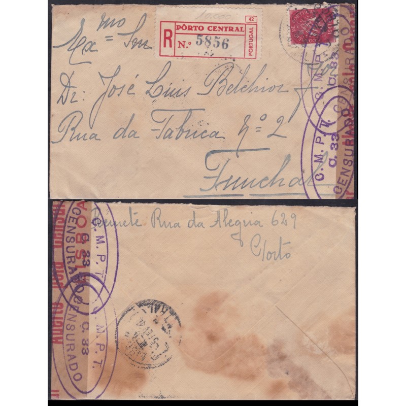 Sobrescrito circulado a 4 de Fevereiro 1944. Com Cinta de censura em papel com a legenda "Aberto pela Censura Lisboa" e carimbo Duplo Oval "C.M.P.T. C33 Censurado" a violeta. Exemplar em boas condições.