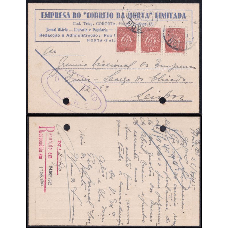 Inteiro Postal Publicitário circulado a 26 de Março de 1945. Com marca oval " C.M.P.T. nº? Censura" a Violeta. Exemplar em boas condições.