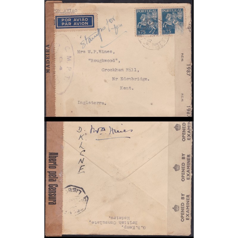 Sobrescrito circulado a 18 de Setembro de 1940. Com uma Cinta de censura em papel com a legenda " Aberto pela Censura Madeira" e outra "Opened By Examiner 1987" e carimbo Oval "C.M.P.T. C4 Censurado". Exemplar em boas condições.