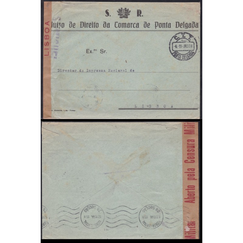 Sobrescrito circulado a 6 de Novembro de 1944. Com uma Cinta de censura em papel com a legenda " Aberto pela Censura Militar Lisboa" e marca "S. MiGUEL" a violeta. Exemplar em boas condições.