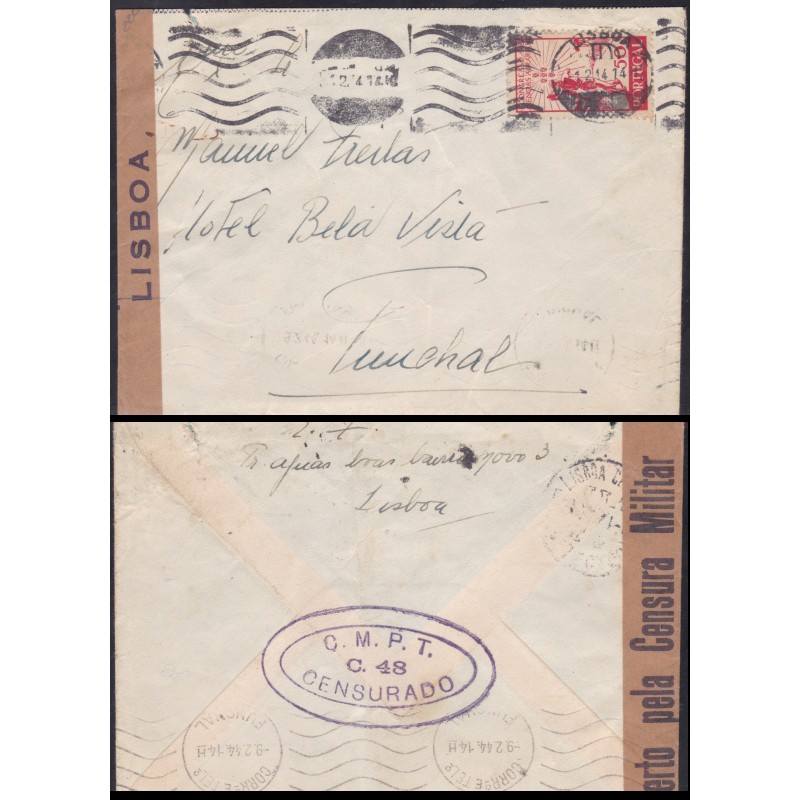Sobrescrito circulado a 1 de Fevereiro de 1944. Com uma Cinta de censura em papel com a legenda " Aberto pela Censura Militar Lisboa" e marca Oval "C.M.P.T. C48 Censurado" a violeta. Exemplar em boas condições.
