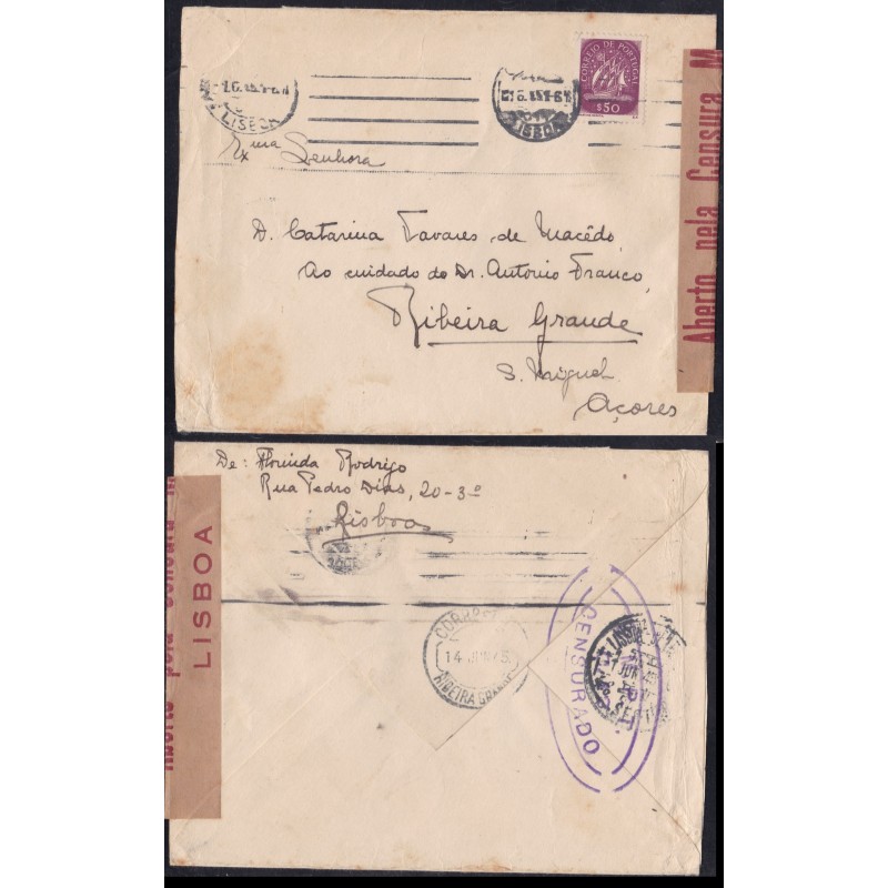 Sobrescrito circulado a 17 de Janeiro de 1949. Com Cinta de censura em papel com a legenda "Aberto pela Censura Militar de Angra do Heroismo" e carimbo oval "C.M.P.T. 4 Censura" e carimbo circular "M.G C.M.P.T. P37" a Violeta. Exemplar em boas condições.