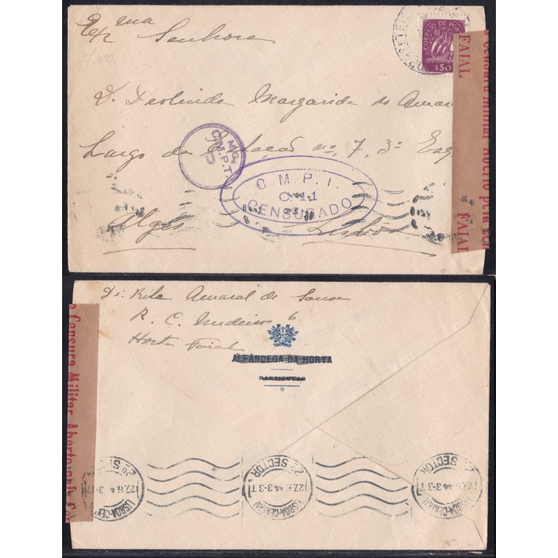 Sobrescrito circulado em Maio de 1943. Com uma Cinta de censura em papel com a legenda " Aberto pela Censura Militar Faial" e marca Oval "C.M.P.T. C11 Censurado" a violeta. Exemplar em boas condições.