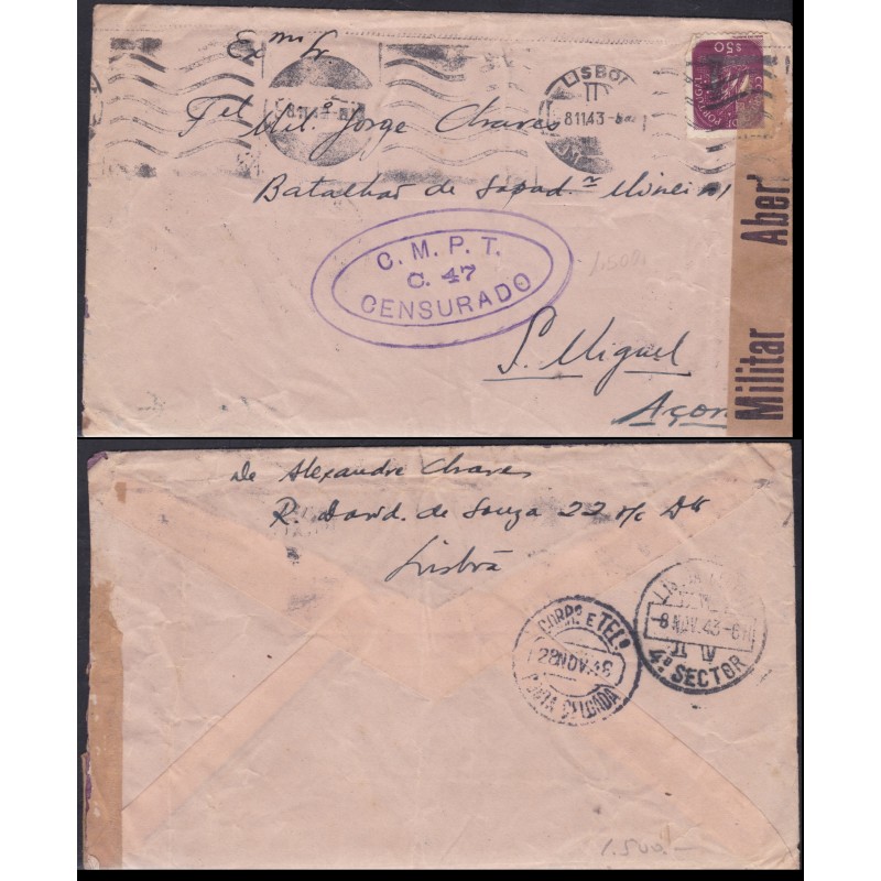 Sobrescrito circulado a 8 de Novembro de 1943. Com uma Cinta de censura em papel com a legenda " Aberto pela Censura Militar" e marca Oval "C.M.P.T. C47 Censurado" a violeta. Exemplar em boas condições.