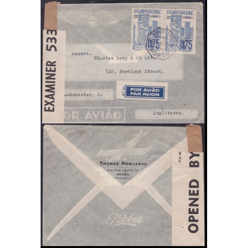 Sobrescrito circulado a 8 de Novembro de 1940. Com uma Cinta de censura em papel com a legenda " Opened By Examiner 533". Exemplar em boas condições.