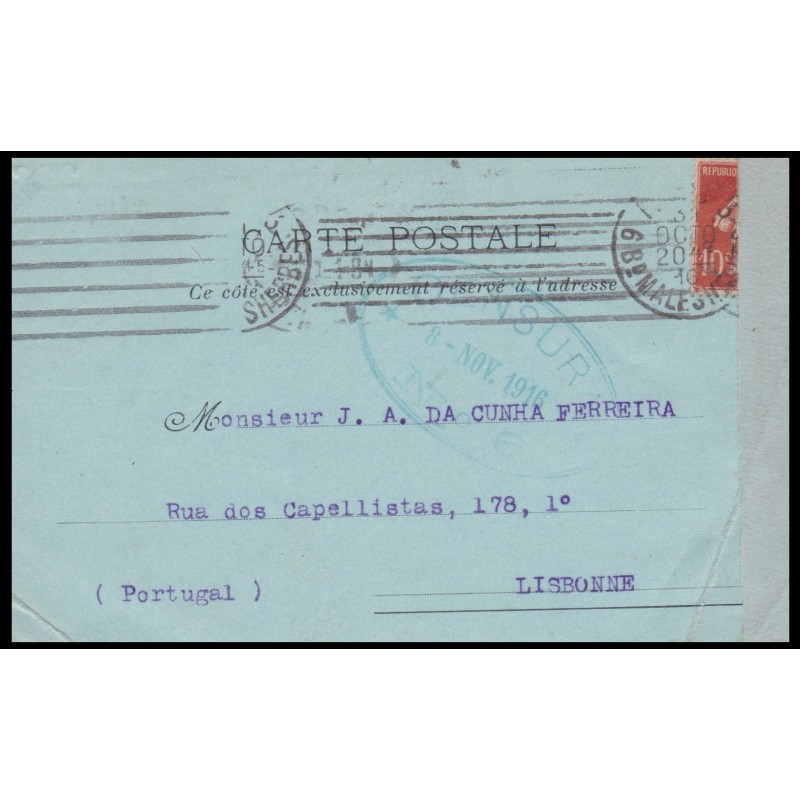 Sobrescrito circulado a 15 de Junho de 1919. Com uma Cinta de censura em papel com a legenda " Controle Posta Militar" e carimbos Oval Franceses . Exemplar em boas condições.
