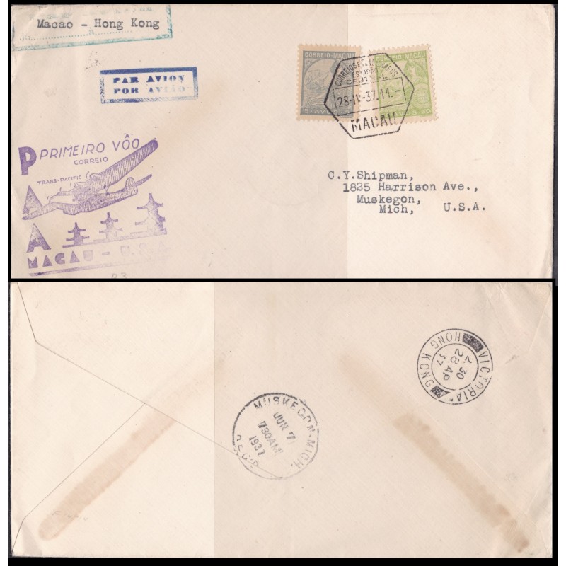 Macau - 1º Voo Trans-Pacific - Carta circulada em 28 de Novembro de 1937 com marca de passagem por Hong-Kong e marca de chegada no verso. Exemplar em boas condições.