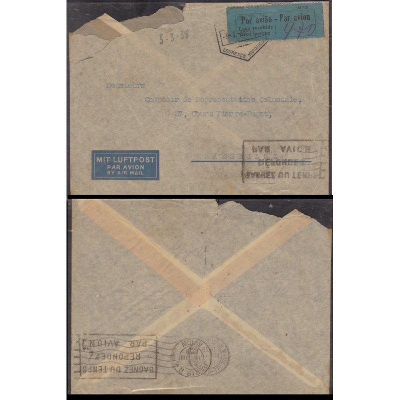 Moçambique - Carta com etiqueta de Correio Aéreo Taxe Perçue nº 6, circulada em 3 de Março de 1938. Exemplar com sobrescrito danificado.