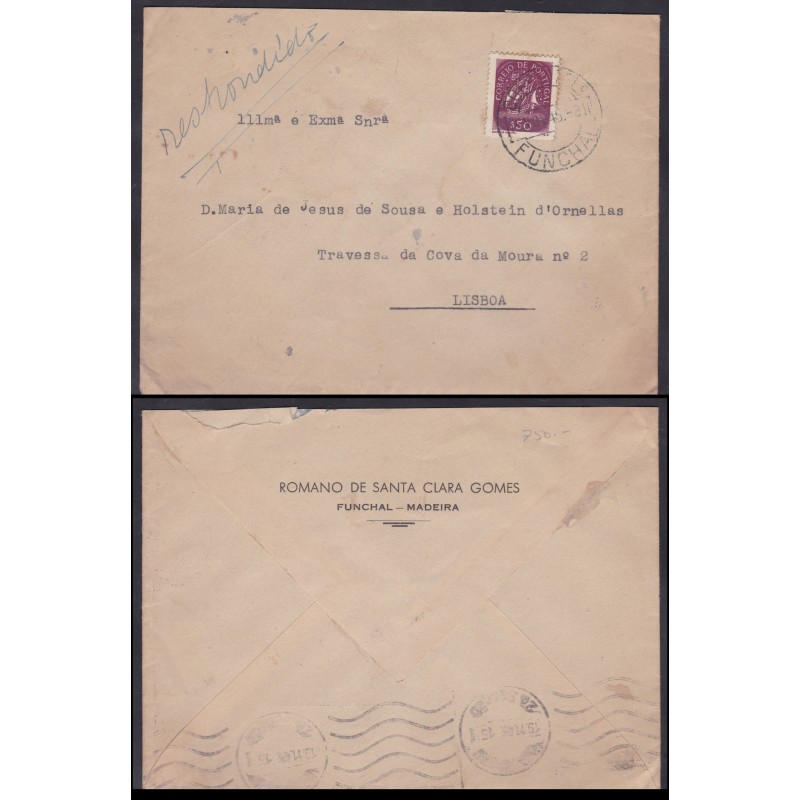 Carta circulada 23 de Abril 1948 com passagem por Lisboa. Exemplar em boas condições.