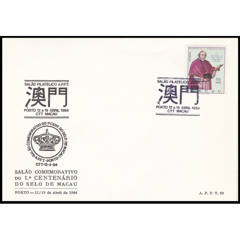 Macau - Sobrescrito com carimbo comemorativo sob selo nº 423. Exemplar em boas condições.