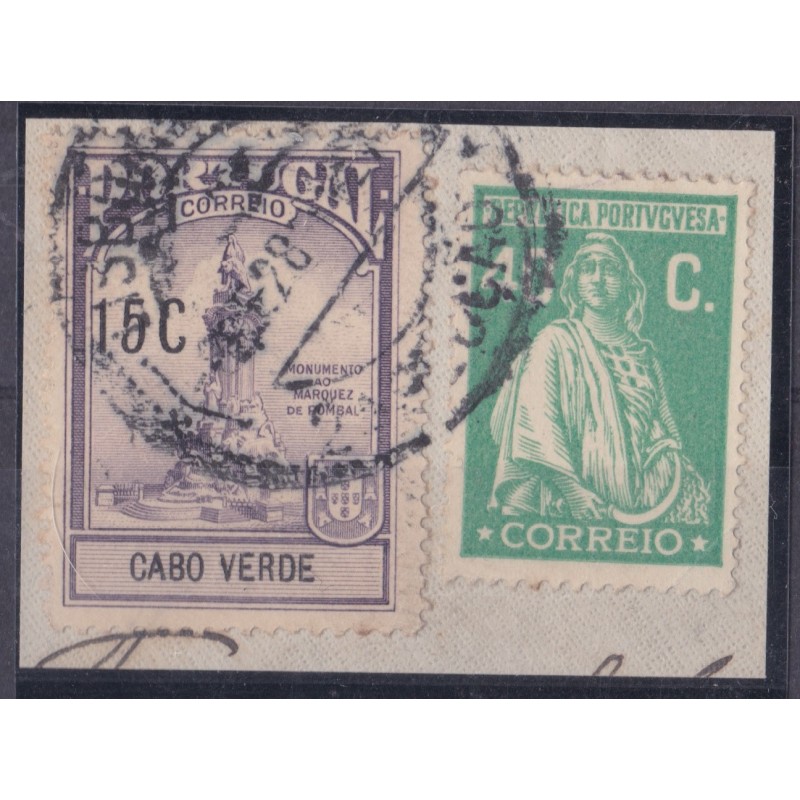 Lisboa - Fragmento com selos nº 406 e selo adicional do Marques de Pombal de Cabo Verde. Exemplar em boas condições.