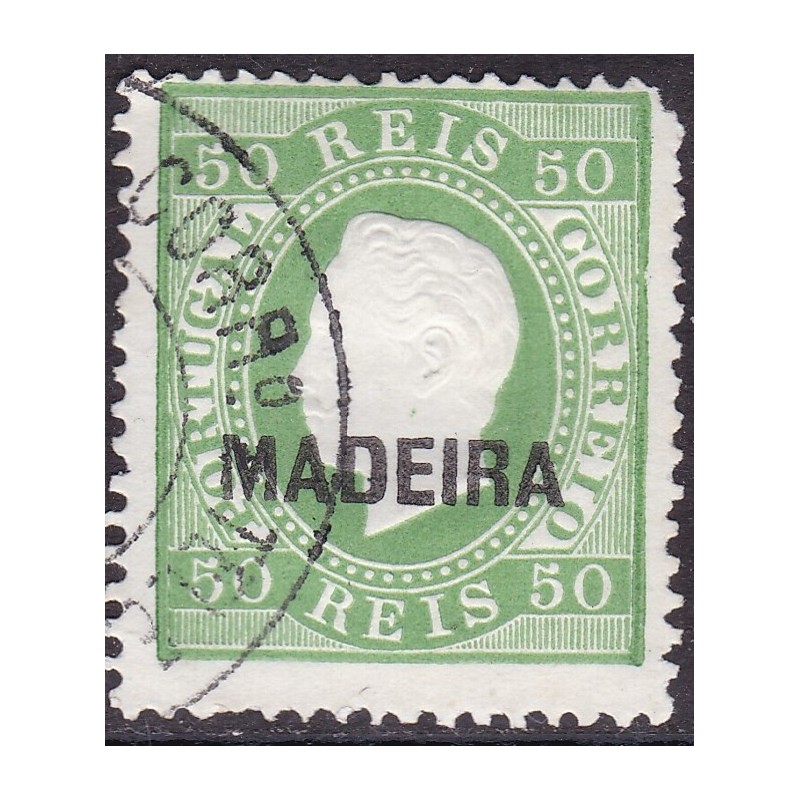 Selo Nº 50 sobrecarga Açores descentrada. Exemplar com denteado defeituoso.