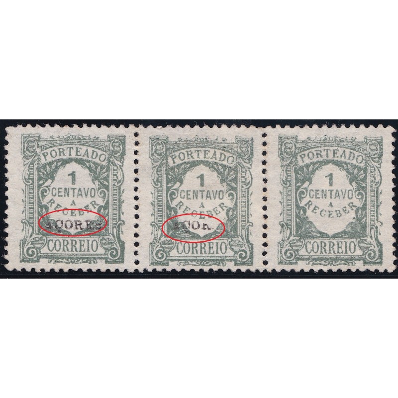 tira de 3 selos Nº P22 sem goma - Sobrecarga AÇORES DEFEITUOSA e um dos selos sem sobrecarga