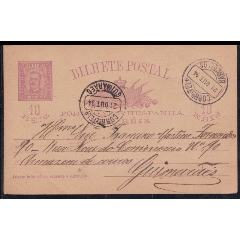 Inteiros Postais nº 13 - Circulado a 21 de Outubro de 1894 de Barcelos para Guimarães.