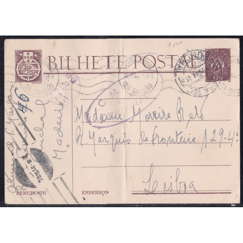 Inteiros Postais nº 98 Censurado - Emblema dos C.T.T. à esquerda Circulado de Funchal para Lisboa.