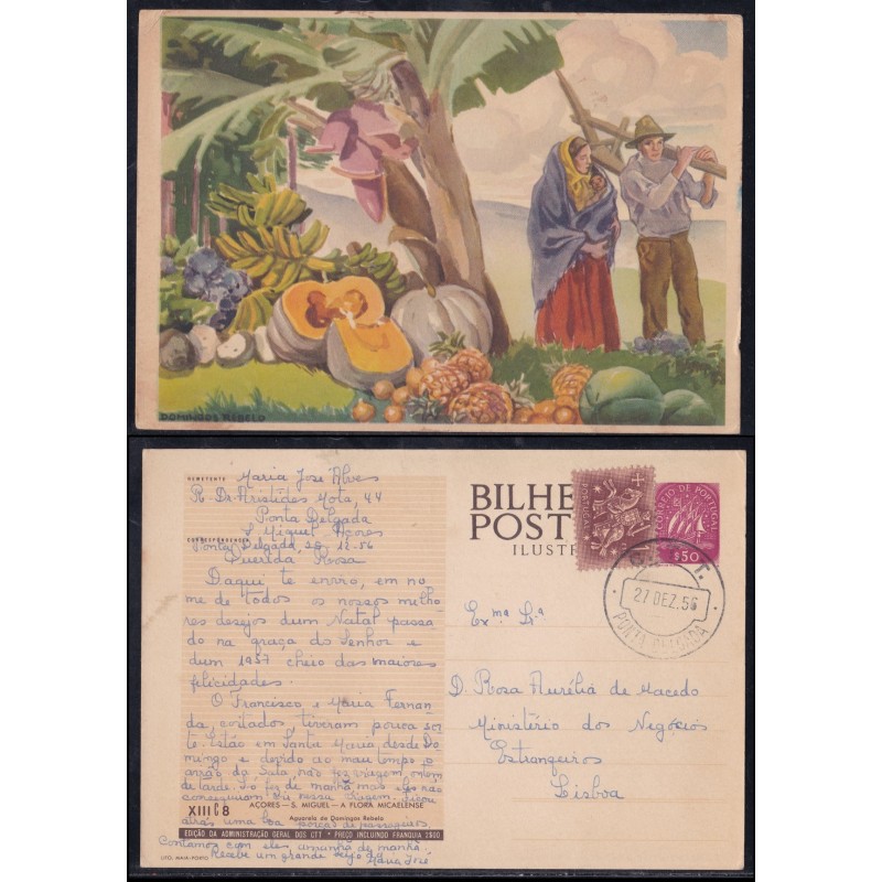 Inteiro Postal Circulado nº XIII C8 - Açores - S. Miguel, Serie G. Aguarela de Domingos Rebelo. Exemplar em boas condições